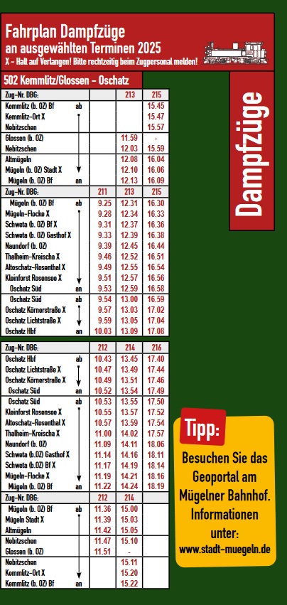 Die Dampffahrten beginnen 9.25 Uhr, 12.31 Uhr und 16.30 Uhr am Bahnhof in Mügeln. Vom Bahnhof Oschatz ist jeweils 10.43 Uhr, 13.45 Uhr und 17.40 Uhr Abfahrt. Gehalten wird bei Bedarf an allen Unterwegsbahnhöfen.