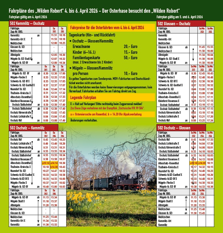 An allen drei Tagen wird die in Mügeln ansässige Dampflok mit der Bezeichnung: „Sächsische IV K 99 584 zwischen Oschatz und Mügeln im Einsatz sein. Unterstützung erfährt sie auch in diesem Jahr von der ebenfalls in Mügeln fahrenden Diesellok. Am Ostersonn- und montag werden zusätzliche Fahrten nach Glossen angeboten. Dort bietet sich die Möglichkeit in die Wagen der Glossener Feldbahn umzusteigen.