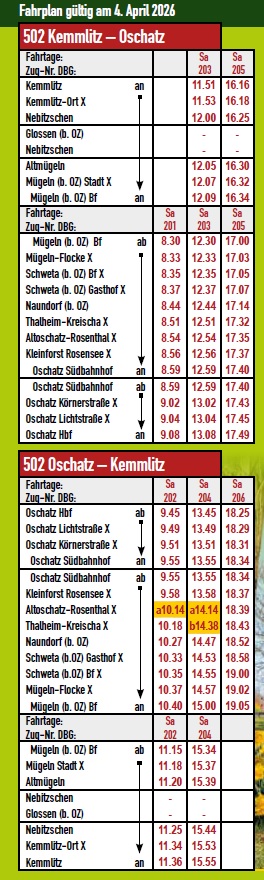 ab Oschatz in Richtung Mügeln: 09.45 Uhr, 13.45 Uhr, 18.25 Uhr
