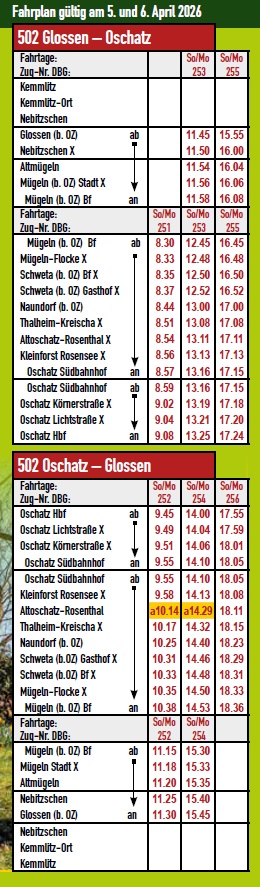 ab Oschatz in Richtung Mügeln: 09.45 Uhr, 14.00 Uhr, 17.55 Uhr