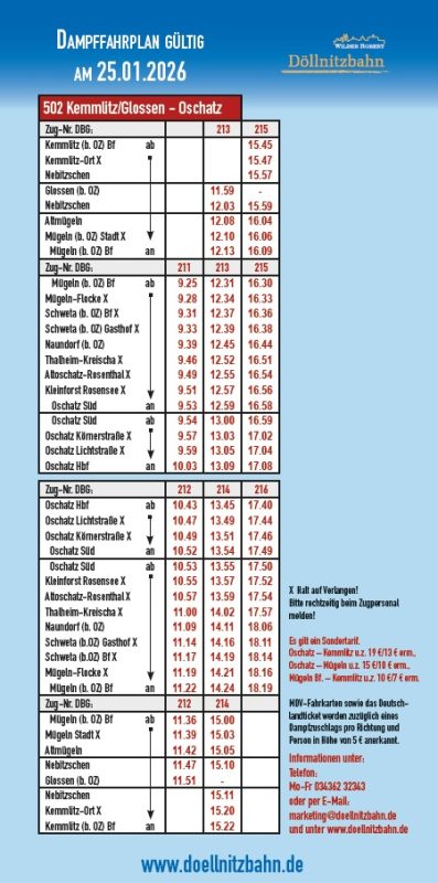 Weitere Informationen zu den Veranstaltungsterminen erhalten Sie unter: 034362/32343 (Mo-Fr) und auf facebook/doellnitzbahn/wilder robert