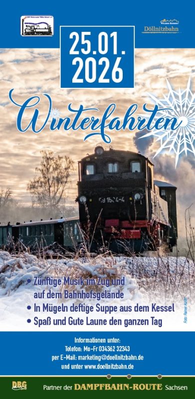Am Sonntag, den 25. Janaur wollen wir gemeinsam mit Ihnen, liebe Gäste, eine besondere Winterfahrt unternehmen. Mit musikalischer Begleitung einer Band aus Oschatz und leckerer Suppe aus dem Feuerkessel wollen wir den Winter anlocken oder vertreiben. Jeder wie er möchte. Es darf getanzt und gesungen werden und unser „Chefkoch“ gibt wieder sein Bestes am Suppenkessel.